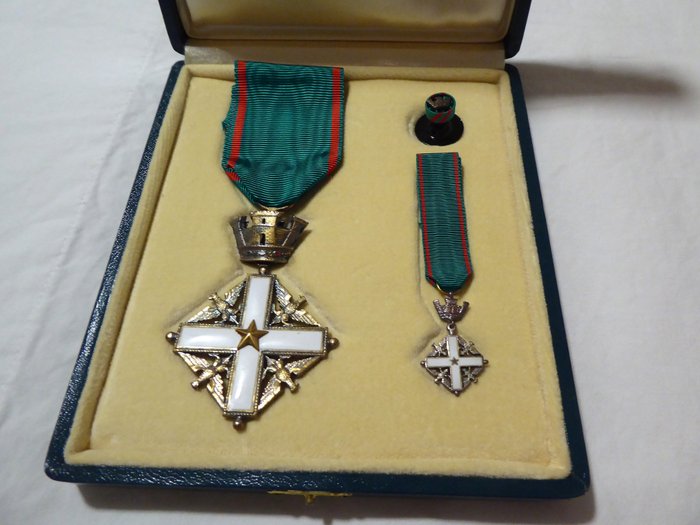 1) Kruis van de Orde van Verdienste van de Italiaanse Republiek, in verguld zilver ("Vermeille"), titel "800" (keurmerk op lus), originele periode zijden lint, centrale gouden ster, polychroom glasachtig email;