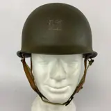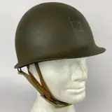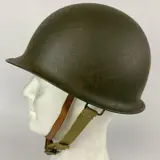 Ter veiling aangeboden deze naoorlogse Amerikaanse M1-helm achterkant, gebruikt in de naoorlogse gegolfde groene kleur. Mobiel ringmodel. Kaki canvas bandjes. Ringen A, en canvas kinriem + lederen kinriem op de voering. Binnenwerk van kunststof.