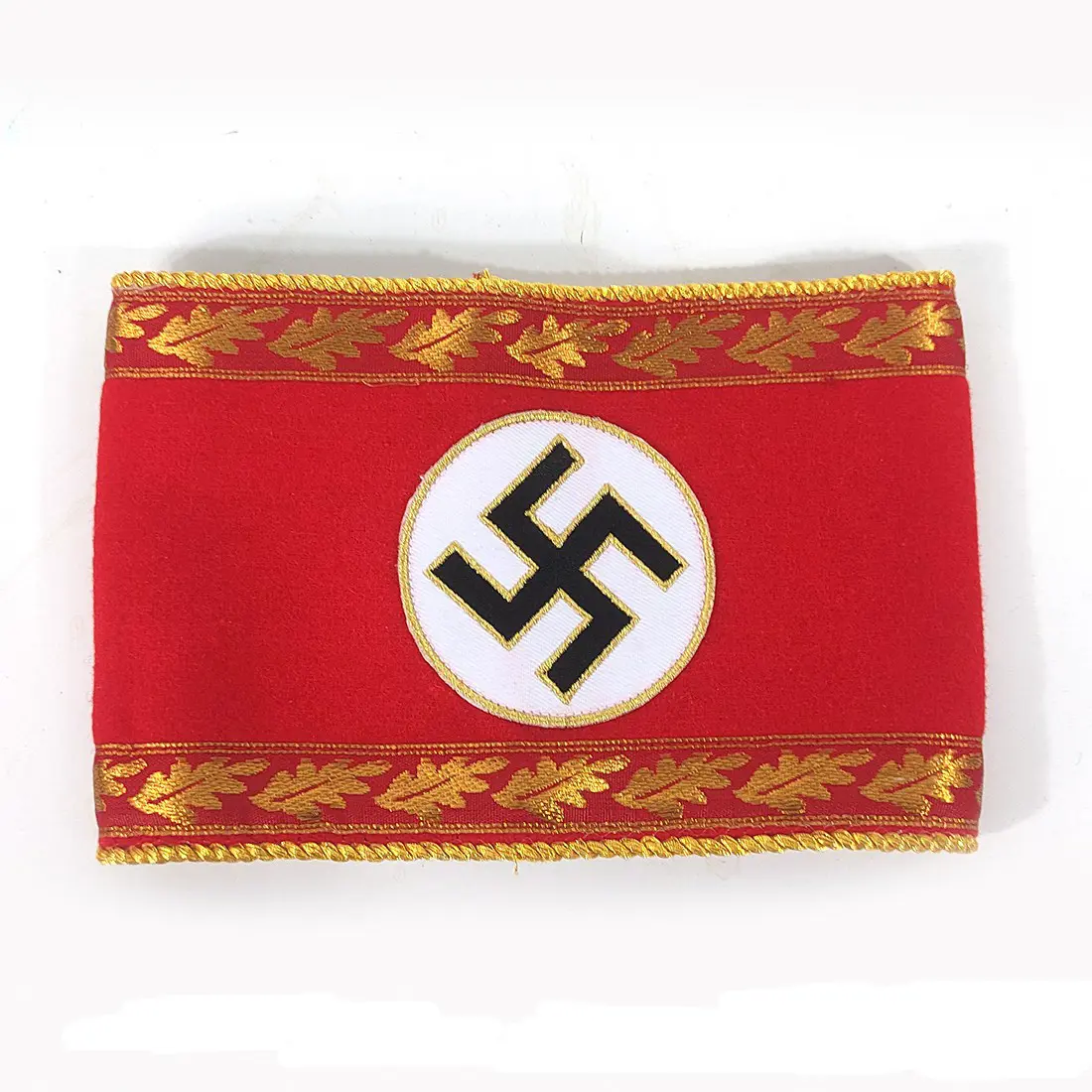 Te koop NSDAP Armband Hoofd Afdelings Leider. NSDAP-armband voor een hoofd afdelingsleider (Hauptamtes), met sierlijke, machinaal geweven eikenbladeren van gouddraad en aantrekkelijke witte biezen aan de boven- en onderrand die de rang van Hauptamtes aangeven. Replica gemaakt met rode wol, machinaal geweven hakenkruis, verrijkt met gouden machinaal borduurwerk en machinaal aan de band genaaid met gouddraad. Verzendkosten €.4,95