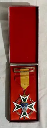 Spanje. Oud ridderkruis van een adellijke orde in originele doos. Een prachtige oude adelmedaille met een heraldisch schild en kruis van de Orde van Malta geëmailleerd in groen met een witte rand. Goede afwerkingen, vuur email. Met gouden veters en schild. Gemaakt in twee delen. Heel goede staat. Uitstekend stuk voor uw verzameling. (leger militaire orde ridderlijkheid ridder nobele adel krijger religie geloof christendom christen oorlog heilig embleem onderscheidend tempel schild insigne metselwerk tempelier metselwerk insigne).