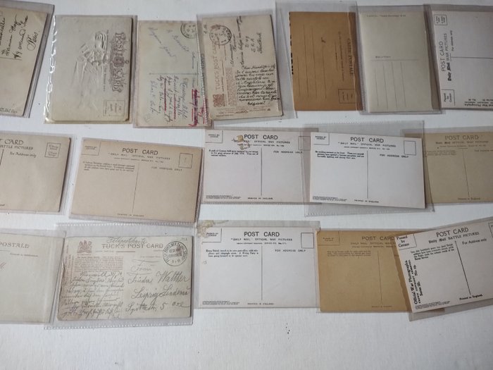Lot Postkaarten Britse militairen , sommige beschreven en met postzegels , allen in een plastic beschermhoesje , 25 stuks , dateringen moeilijk leesbaar
