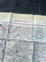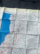 Great original Cold War era RAF SILK!!! Escape/Evasion map as issued to combat pilots, produced in 1953 at the height of the cold war, and marked as restricted/classified. Evasion charts or escape maps are maps made for servicemembers, and intended to be used when caught behind enemy lines to assist in performing escape and evasion. Such documents were secreted to prisoners of war by various means to aid in escape attempts. During the Korean war, these clandestine maps were used by American airforce servicemen to escape from behind enemy lines. Special material was used for this purpose, due to the need for a material that would be hardier than paper, and would not tear or dissolve in water.[1]