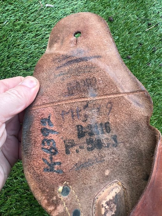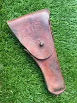 Great M1916 holster for the Colt M1911 .45 pistol from WW2 marked Enger Kress. Enger Kress was a famous maker of these holsters during WW2. Adopted in 1916, this holster was standard issue for infantry,, officers, airborne and regular units.. In combat areas, all sorts of troops found ways to "acquire" handguns and the regulations as to who was and wasn't permitted to carry them were rarely enforced. IIt has several laundry numbers inside, which in theory could be used to trace the original owner.
