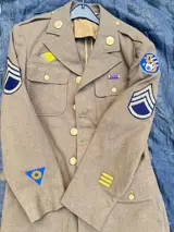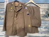 Great uniform grouping, size 38R (a relatively latge size) dated 1942 and 1945, of a member of the famous 5th USAAF (see histort below, they say extensive aerial combat in the Pacific). The 1942-dated A-class jacket has a nice set of US Flight collar discs, Staff Sgt rank chevrons, 3 overseas stripes denoting 1,5 year overseas in the pacific, a ruputured duck denoting he was honorfully released following the end of WW2 and a nice purple heart ribbon bar which seems to be on the jacket for a very long time. Both the jacket and pants have the same laundry number. The pants is dated march 1945. Both the pants and jacket are in really good condition. The engineering specialty badge on the sleeve indicates he was a flight engineer during WW2.