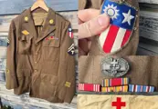- his NAMED (see photo's) A-class jacket with combat medic sterling badge, medal bars (Good Conduct Medal, Pacific campaign medal with TWO battle stars, WW2 Victory Medal and US Campaign Medal). The jacket has a set of beautiful medic collar discs and is dated 1942 and is in really nicely used condition, and has original applied China Birma Theatre Operations Patch on the right sleeve and a Western Pacific Forces patch on the left sleeve. The rank of 5th Tech Sgt chevrons are also present and a 3 overseas bar patch, indicating Jesse M Nobels served 1,5 years in the pacific theatre of operations as a combat medic. He also received a Meritorious Unit Commendation patch which is neatly placed on the lower sleeve.