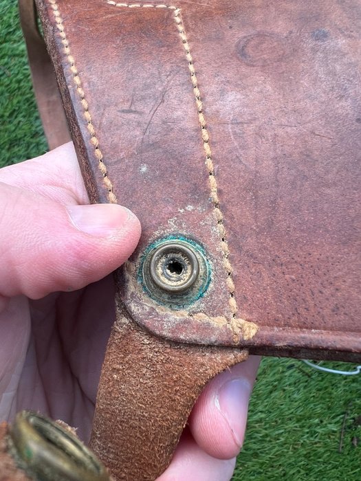 Great leather shoulder holster for the Colt M1911 .45 pistol from WW2 marked Enger-Kress. and US. Enger-Kress was a famous maker of these holsters during WW2. Adopted in 1942, this holster was standard issue for aircraft and tank crews, and was often used by officers who preferred it to the hip holster. In combat areas, all sorts of troops found ways to "acquire" handguns and the regulations as to who was and wasn't permitted to carry them were rarely enforced. The nice things is that the strap buttons are ALL functionial. The press studs are almost always broken! The holster has a beautiful patina and has a nice light brown color, with the characteristic green /dust residue on the brass parts that was build up for decades (this can be easily removed, is not stuck at all to the brass, but adds to the patina of the holster i think).