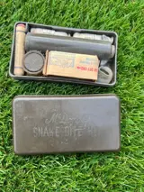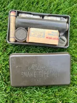 The Snake-Bite Kit, sometimes designated Suction Kit, was a first-aid item used against snake or poison insect bites, and for wounds caused by poison arrows or other missiles. It is to be used together with a Tourniquet. The Kit was distributed among troops operating in closed and remote jungle areas. In some cases, it would have been used as a personal first-aid item by Aidmen and Hospital Corpsmen or by individual soldiers.