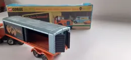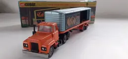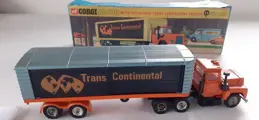 Corgi Toys 1100 Mack met de Trans-continental oplegger. Het model is mint. Nagenoeg geen lakverlies op de koppeling tussen trekker en oplegger. De veerbladen zijn heel. De doos is compleet met wat verouderingssporen langs de randen, met name de linker kant. In de linker onderhoek van het cellofaan zit een klein gaatje.