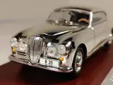 De Lancia Aurelia uitgevoerd in chroom op een fraai houten plateau in een show-case.