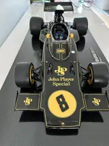 Emerson Fittipaldi Lotus 72D, Winnaar 1972 Britse Formule 1 Grand Prix. Zeer groot 1:8 Lotus 72 model met vitrine