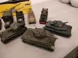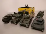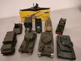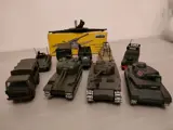 STEVIG Frankrijk. 10 militaire voertuigen. 1 Originele doos met daarin een 105 mm fort en luchtafweerkanon