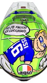 Spectaculaire helm van de beste motorrijder aller tijden, de Italiaanse rijder Valentino Rossi met het Yamaha-team in Mugello 2017, waar hij hulde bracht aan de voetballer Francesco Totti, die met pensioen ging, en aan Nicky Hayden "69", die binnenkort was overleden voor.
