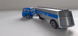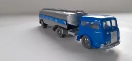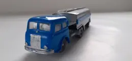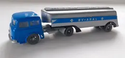 Siku V45 Aral 21.000 liter tankwagen zilvergrijs metallic met op de zijkanten logo's van Aral en het opschrift BV-ARAL. Sticker op de achterkant ontbreekt. Reservewiel onder de oplegger. Blauwe Henschel HS 170T trekker met verzwaard gewicht. Grijs chassis en wielen. Maakt deel uit van de serie Verkeersmodellen uit de jaren 1956-1962 en is dus uim 60 jaar oud.