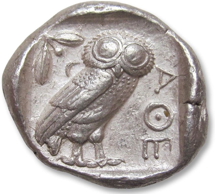 Keerzijde: Uil staande naar rechts met kop naar, olijftwijg en halve maan achter, ΑΘΕ ervoor; allemaal binnen het incuse-plein