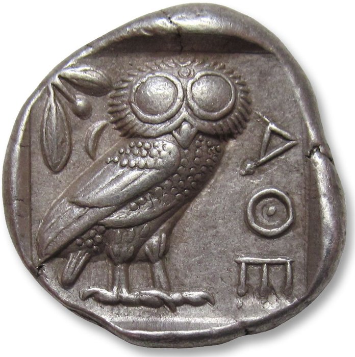 Keerzijde: Uil staande naar rechts met kop naar, olijftwijg en halve maan achter, ΑΘΕ ervoor; allemaal binnen het incuse-plein