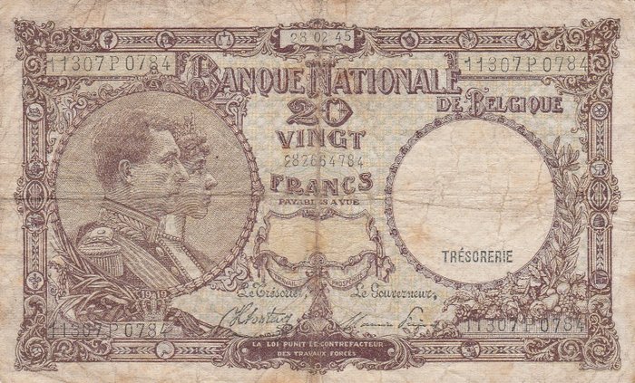 Lot van 5 bankbiljetten uit België en Belgisch Congo. 1 x Pick 14E. 10 Francs. 10 Francs. 12.05.1952. 1 x 111. 20 Francs. 28.02.1945. 3 x 129. 100 Francs. 1958 en 1959. Diverse condities zie foto's en scans.