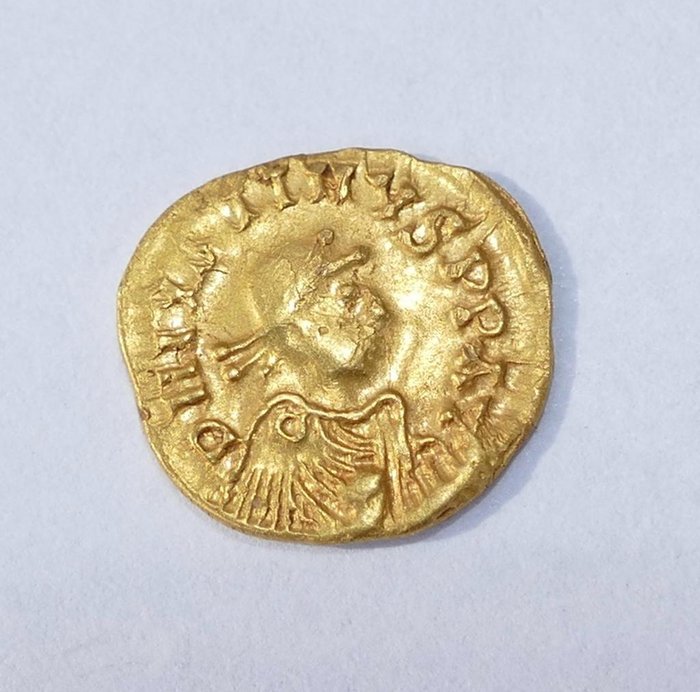 DN IVSTINVS P P AVC. Gediadeemde, gedrapeerde buste met kuras r. Rv. VICTORI Λ Λ VCCCΛ. Victory oprukkende r., handpalm en krans vasthoudend; op veld l. * en r., monogram MAR (afgebonden); in afsnede, COMOB.