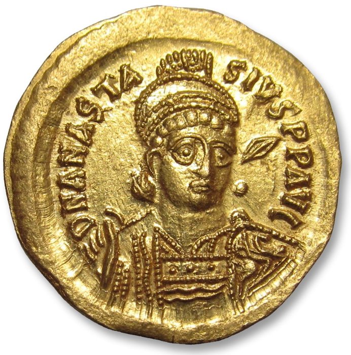 Voorzijde: D N ANASTASIVS P P AVG, buste met helm en harnas iets naar rechts gericht, speer en schild vasthoudend