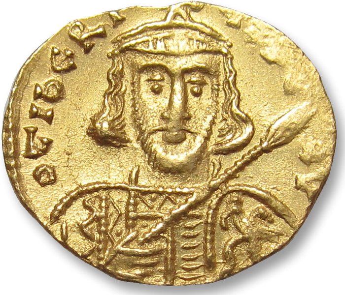Voorzijde: D ƮIbЄRIЧS PЄ AV, gekroonde en gepantserde buste, met korte baard, vasthoudende speer en schild versierd met ruitermotief