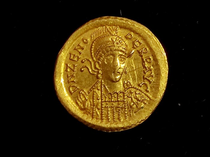 Zeno AV Solidus. Constant in Opel. D N ZENO PERP AVG, borstbeeld met pareldiadeem, gehelmd en in kuras, iets naar rechts gekeerd, speer over rechterschouder en schild versierd met ruitermotief vasthoudend / VICTORIA AVGGG A, Victory staande met gezicht naar links, lang met juwelen bezet kruis; ster in rechterveld, CONOB in afsnede. RIC 929