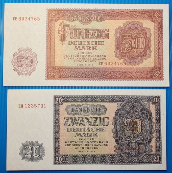 Ik verkoop een verzameling van 20 bankbiljetten die in verschillende decennia zijn uitgegeven in de Duitse Democratische Republiek (DDR).