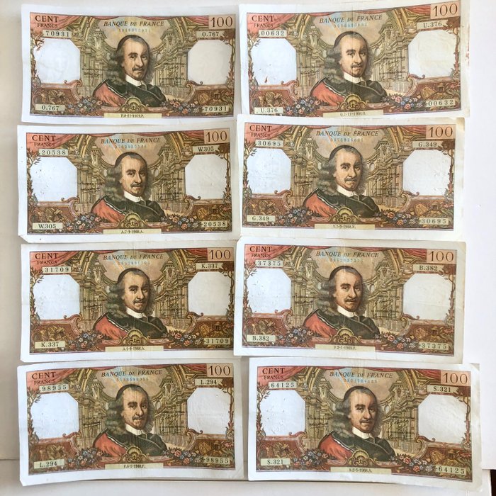 Pakje van 100 Corneille francs van wisselende kwaliteit.