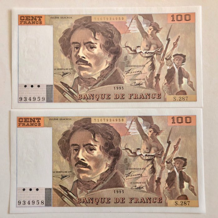 Serie van 6 bankbiljetten van 100 Delacroix-frank achter elkaar: nrs. 934954 tot 934959.