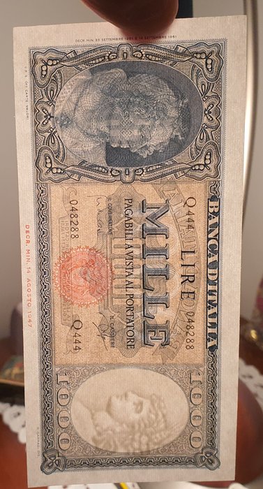 Bankbiljet in het laatste decreet van duizend lire uitgegeven op 25-09-1961 in sublieme uitstekende staat + bankbiljet met bijgevoegd certificaat uitgegeven door Cartamoneta.com door de numismatische expert G. Vendemia. Zie foto bankbiljet en certificaat voor juiste indruk.