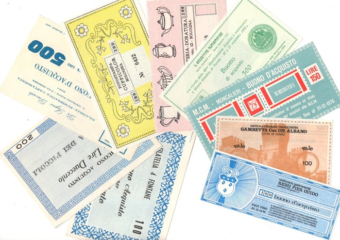 Italië lot van 29 bankbiljetten, republiek, koninkrijk, bezetting, minicheques en aankoopbonnen, dateert van 1918 tot 1995, verschillende graden van conservering van in omloop tot UNC, zoals te zien op de foto's