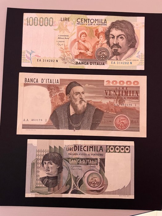 Italië - 3 banconote Lire "Tiziano", "Del Castagno" e "Caravaggio" - Gigante BI 75, 77A, 85; Pick 104a, 106, 117