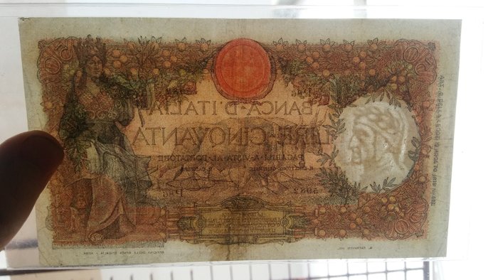 Bankbiljet van 50 lire DUE BUOI, 24, 04, 1918 van 105 jaar geleden, zonder gaten en behandelingen (kleine reparatie middenonder) de kleuren zijn zeer levendig zoals op de foto's te zien is. Klassieke middenvouw. Het bankbiljet is buitengewoon gezien het uiterst delicate en kwetsbare papier. "R2" zeldzaamheid.