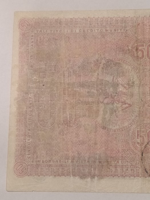 50 lire tegoedgarantie van de Banco di Sicilia.Het kaartje heeft wat vlekjes en gaatjes van het spelden, stempel op de achterkant en mooie kleuren. Uiterst zeldzaam kaartje; .we beschouwen het in BB+ / qSPL behoud Voor de typologie; komt met expertise