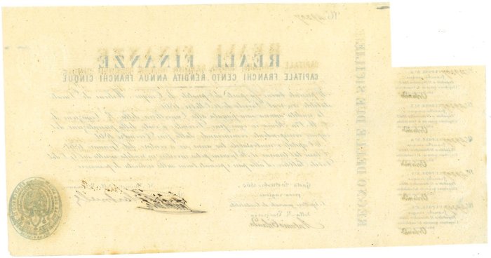 Handtekening van Carbonelli Minister van Financiën van koning Frans II van Bourbon op het financiële document genaamd "Reali Finanze" n. serienummer 49307 - 100 frank kapitaal 100 vijf frank jaarinkomen - Uitgegeven voor het beleg van Gaeta in 1860. Scripopass certificaat van echtheid n. B12277 van 30/01/2023