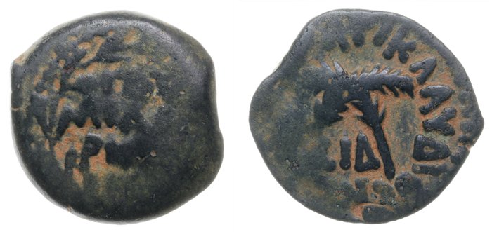 1. Judea, procureurs – Antonius Felix (52-59 n.Chr.) – Æ Prutah, in naam van Claudius en Agrippina Junior. Munt van Jeruzalem. Gedateerd RY 14 van Claudius (54 n.Chr.).