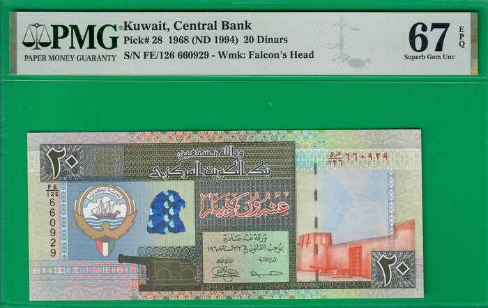 Koeweit 20 dinar 1968 (ND 1994), P28, gegradeerd PMG Superb Gem UNC *67* EPQ!
