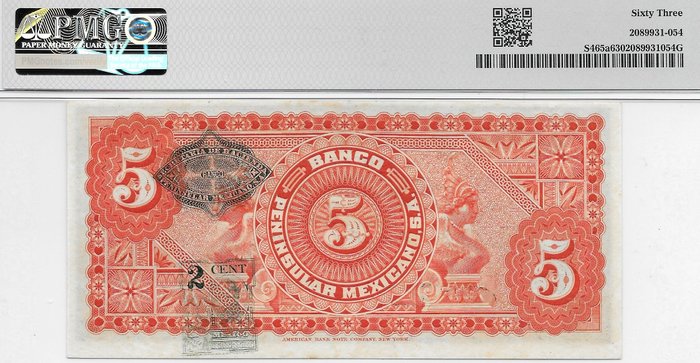 Populair Mexico 1914 5 Peso Banco Peninsular Mexicano P-S465a PMG 63 Keuze UNC. Dit heeft een klassieke en gedetailleerde afbeelding van een trein en een aangename kleur waardoor het een veelgevraagd verzamelobject is.