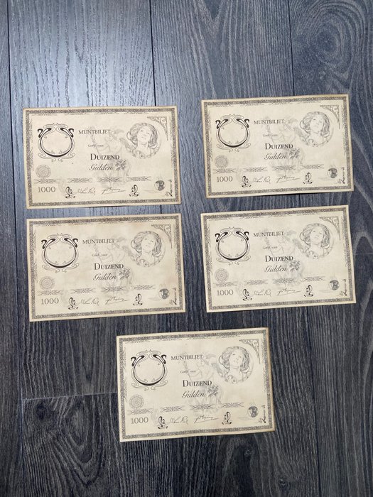 De meest zeldzame waarde van 1000 gulden, een set van 5 in opvolgende serienummers. Unieke set!