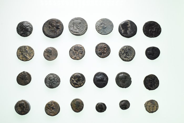 Lot van 24 bronzen munten. Waaronder Seleucidische/Klein-Azië/Romeinse Provinciale/Romeinse Keizerlijke/Byzantijnse bronzen munten.
