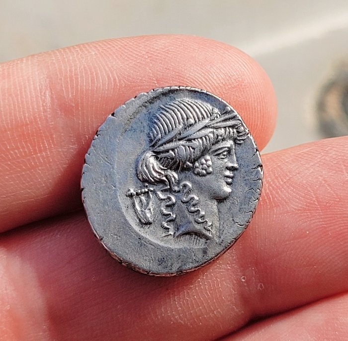 P. Clodius M.v. Turrinus. 42 v.Chr. AR denarius. Romeinse munt. Gelauwerd hoofd van Apollo rechts; lier naar links / Diana Lucifera staand rechts, buigen en trillen over haar schouder, fakkels vasthoudend. Crawford 494/23; CRI 184; Sydenham 1117; Claudia 15; RBW 1727.