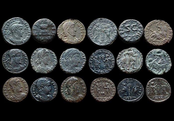 Romeinse Rijk. Lot x 9 Æ Follis/Quadrans: Constantine I, Constantine II, Augustus, Theodosius II,1st century BC-4th century AD