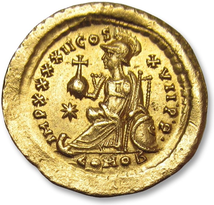 Keerzijde: IMP XXXXII COS XVII • P • P •, Constantinopolis zittend naar links, met globus cruciger en scepter, voet op boeg, schild bij troon; ster in linkerveld, COMOB in afsnede