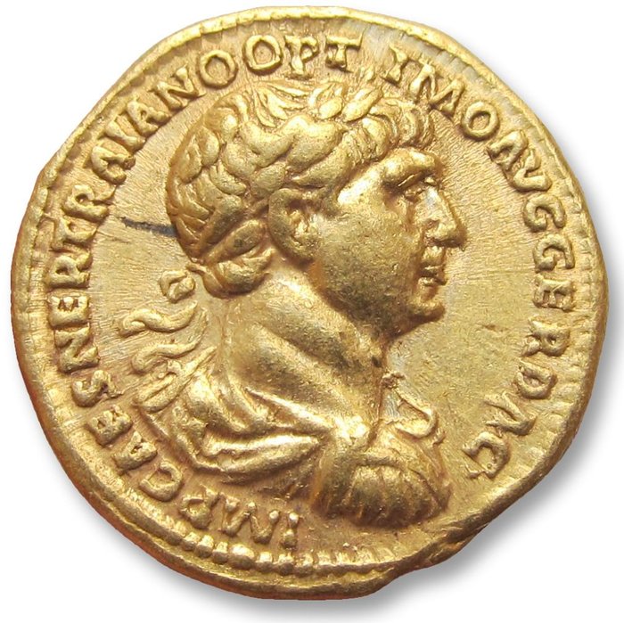 Voorzijde: IMP CAES NER TRAIANO OPTIMO AVG GER DAC, gelauwerde, gedrapeerde en gekurasde buste naar rechts