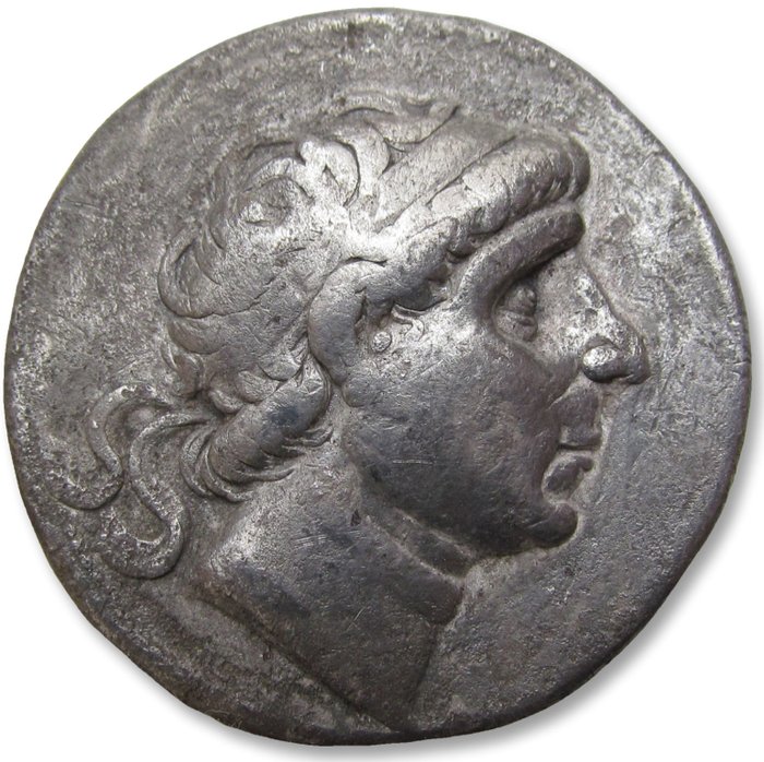 Keerzijde: BAΣIΛEΩΣ ANTIOXOY, Apollo zittend links op omphalos, pijl vasthoudend en rustend op boog; monogram naar links en rechts