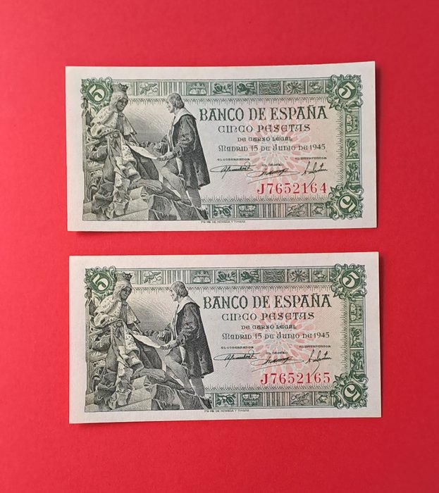 Spanje - 2 x 5 pesetas 1945 - Pick 129a - consecutives