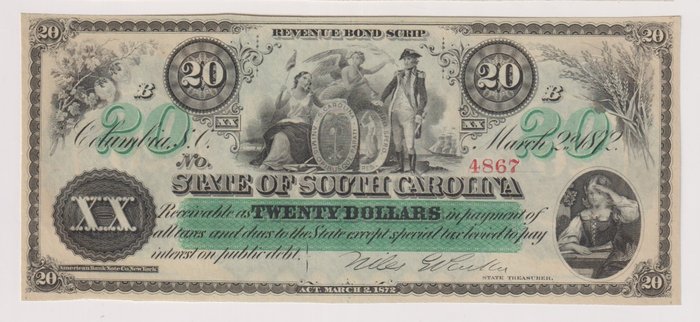 $ 20 VS - 20 staat South Carolina Dollars gedateerd 2 maart 1872