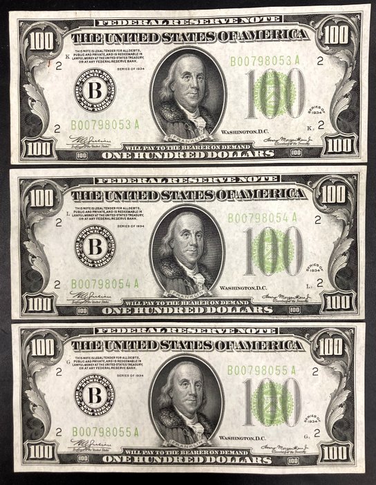 3 Federal Reserve Bank of New York 1934 biljetten van $100