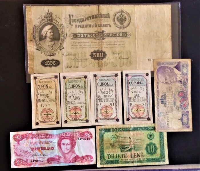 n 4 bankbiljetten en 4 coupons van de wereld zijn bijna allemaal in omloop en met evenredige slijtage. het Russische bankbiljet van 500 roebel, uit 1898, heeft enkele aanpassingen ondergaan om het aanzienlijk te verbeteren