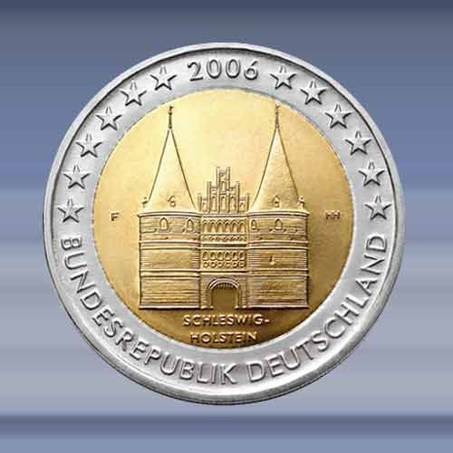 Holstentor Lübeck. (D) (F) de 2 EURO munt is verpakt in een zelfklevende munthouder.