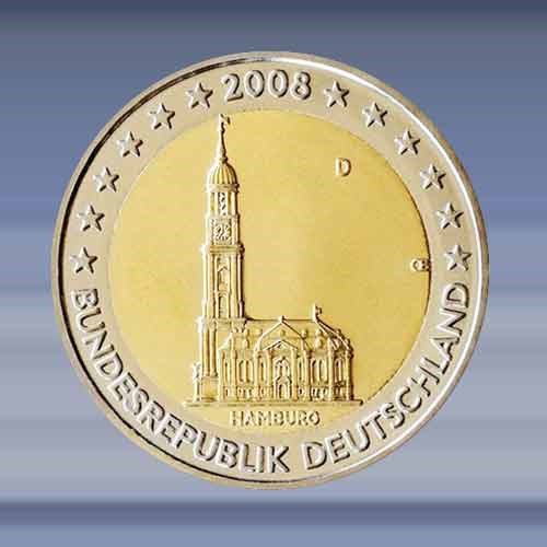 Michaeliskerk Hamburg. (D) (F) (G) de 2 EURO munt is verpakt in een zelfklevende munthouder.