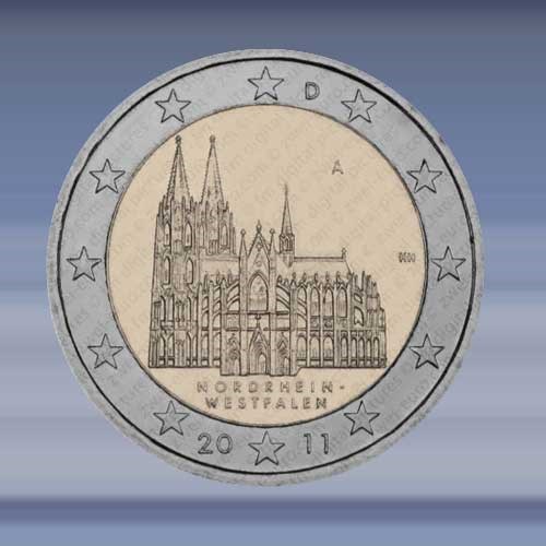 Dom van Keulen. Leverbaar letter (A) (D) (F) (G) (J) de 2 EURO munt is verpakt in een zelfklevende munthouder.